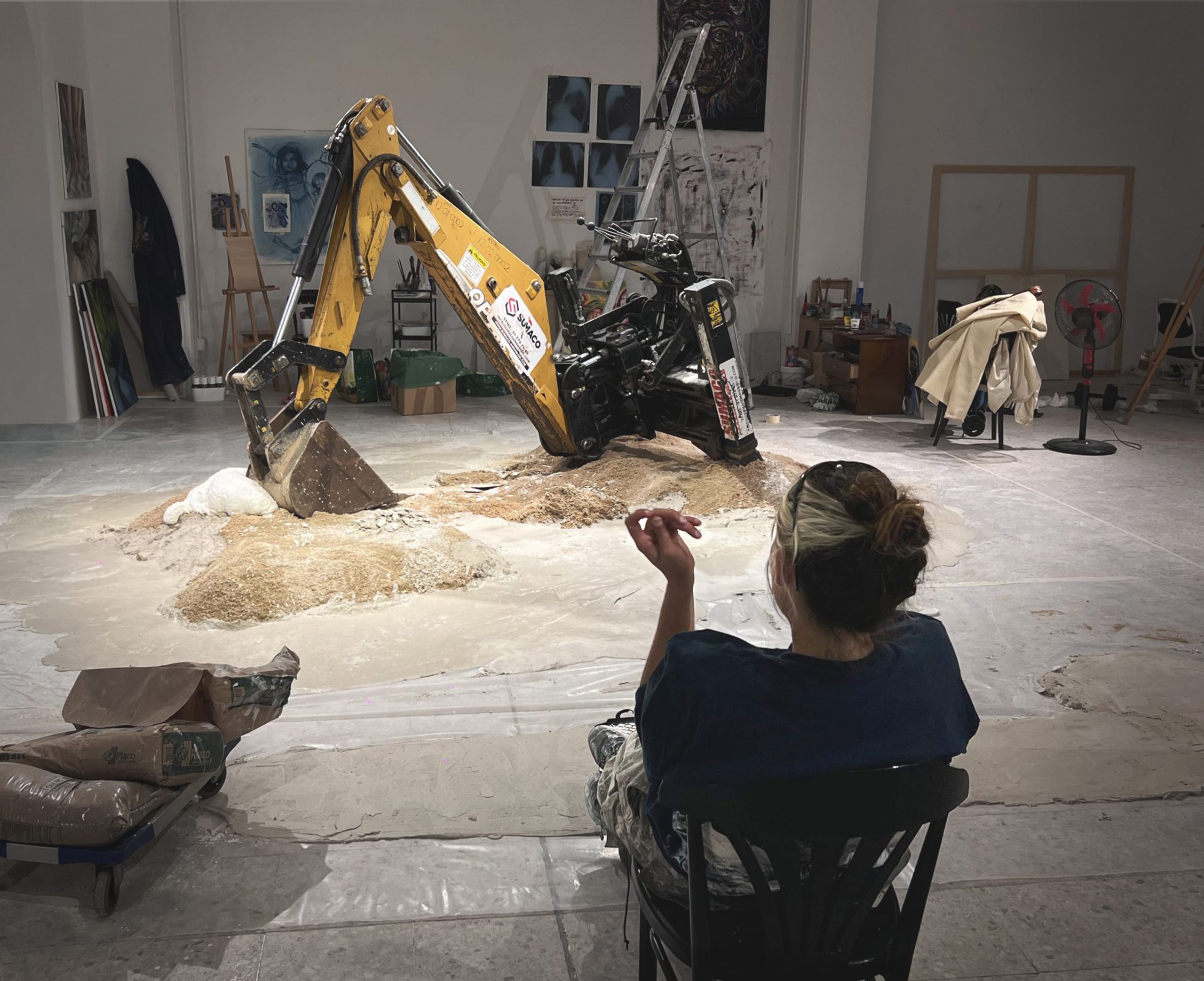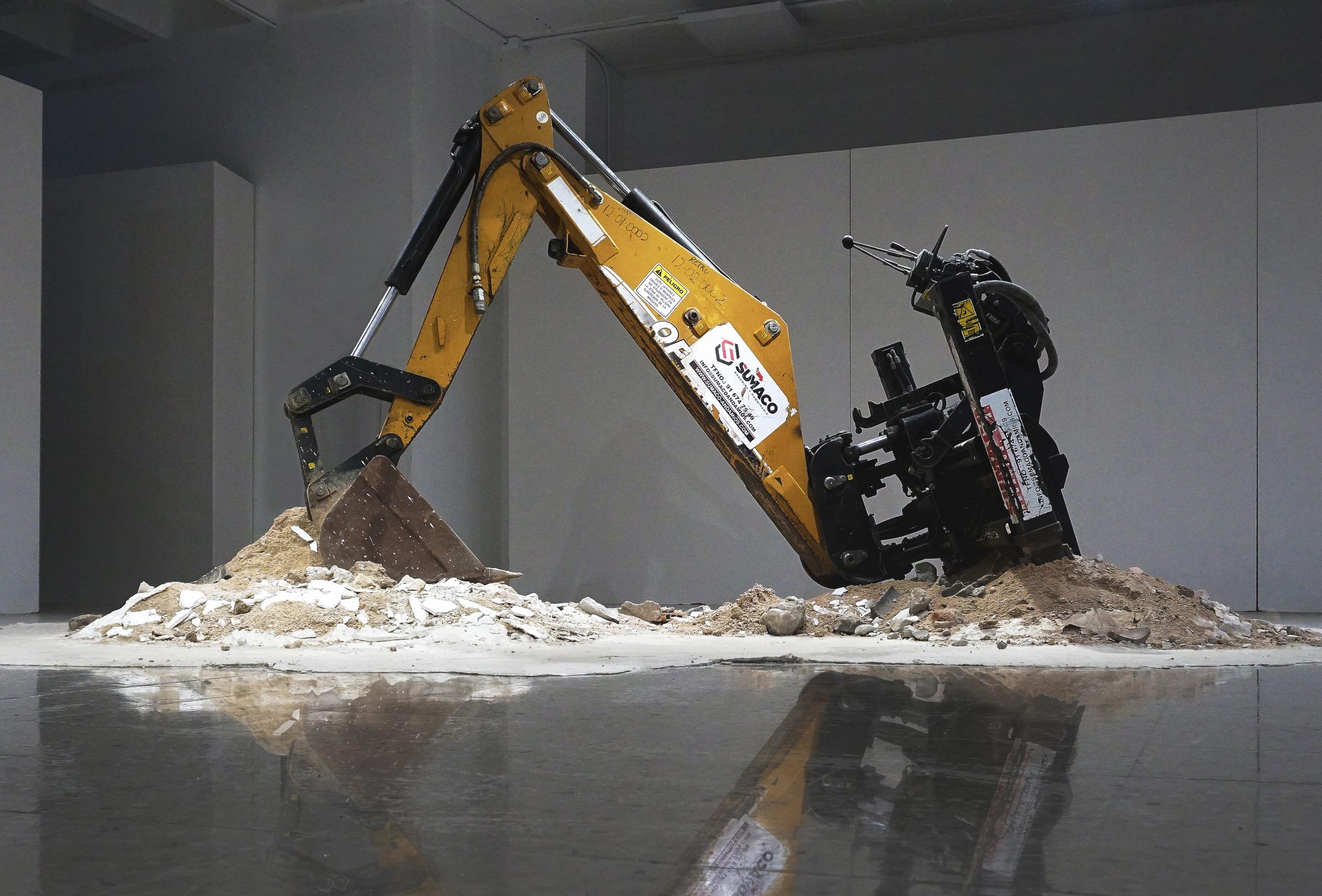 Faketories, 2024. Dimensiones variables. Brazo de miniretro excavadora y escombros.