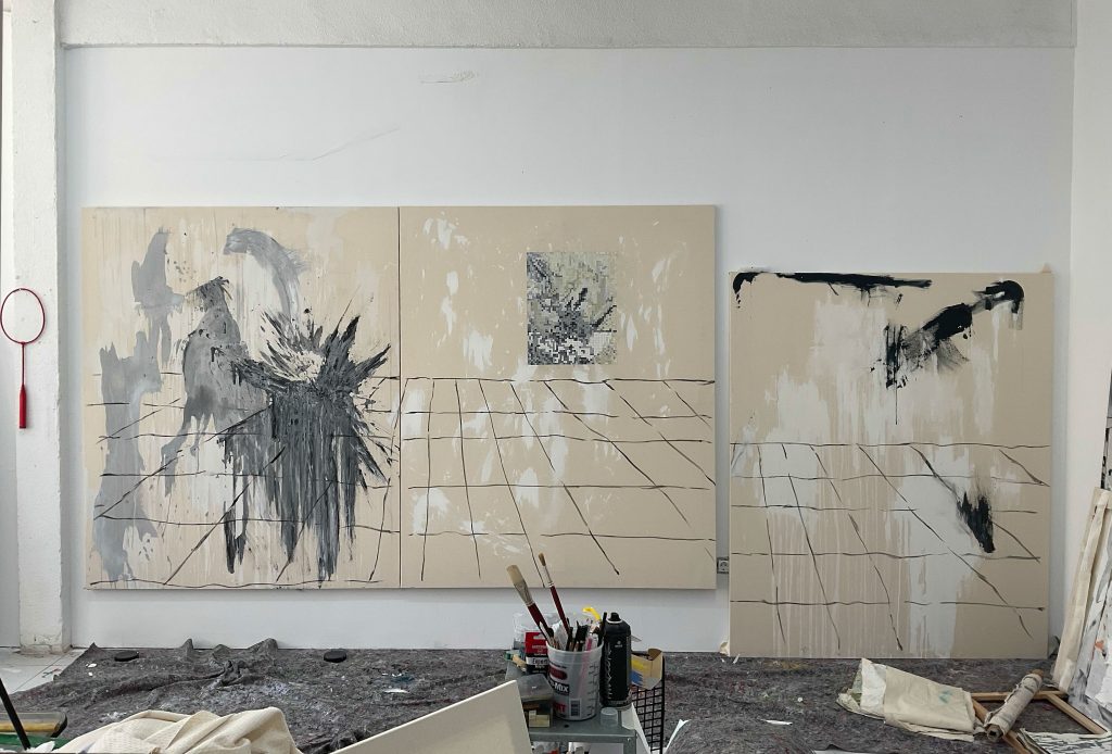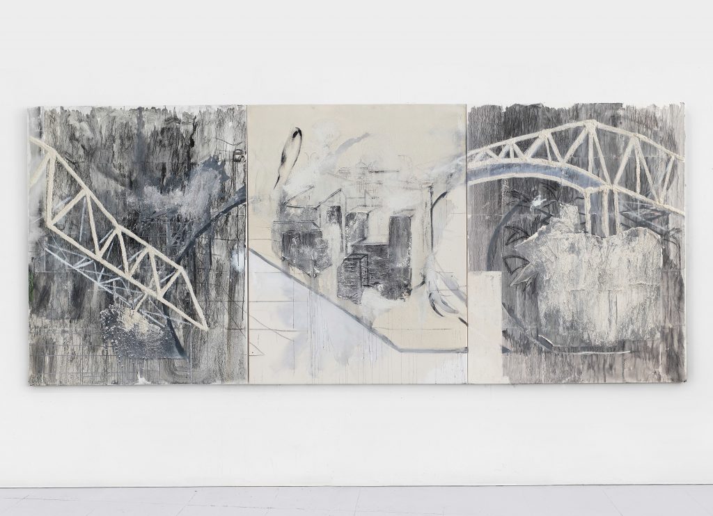 Un borrador, casi una mancha, un descuido, 2025. Tríptico. 146 x 342 cm. Acrílico y hormigón sobre lienzo.