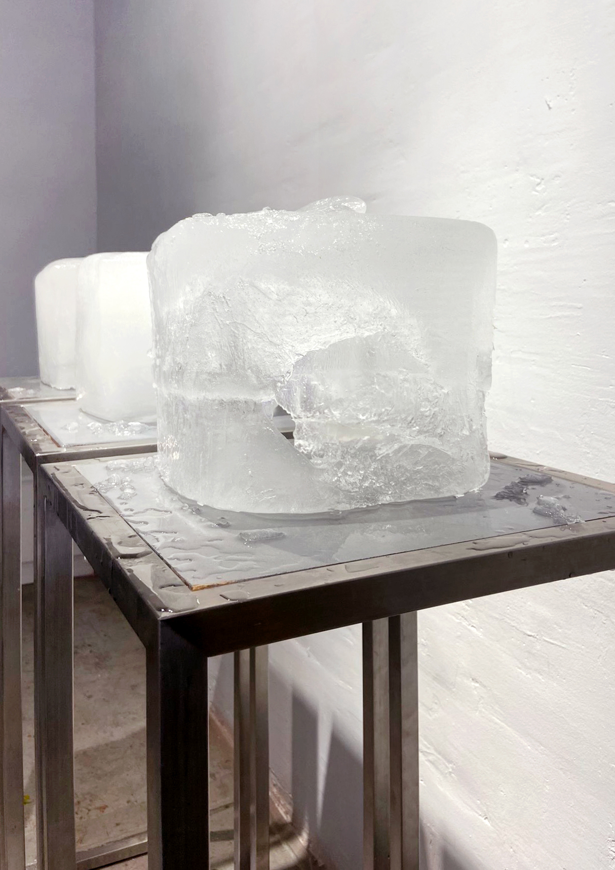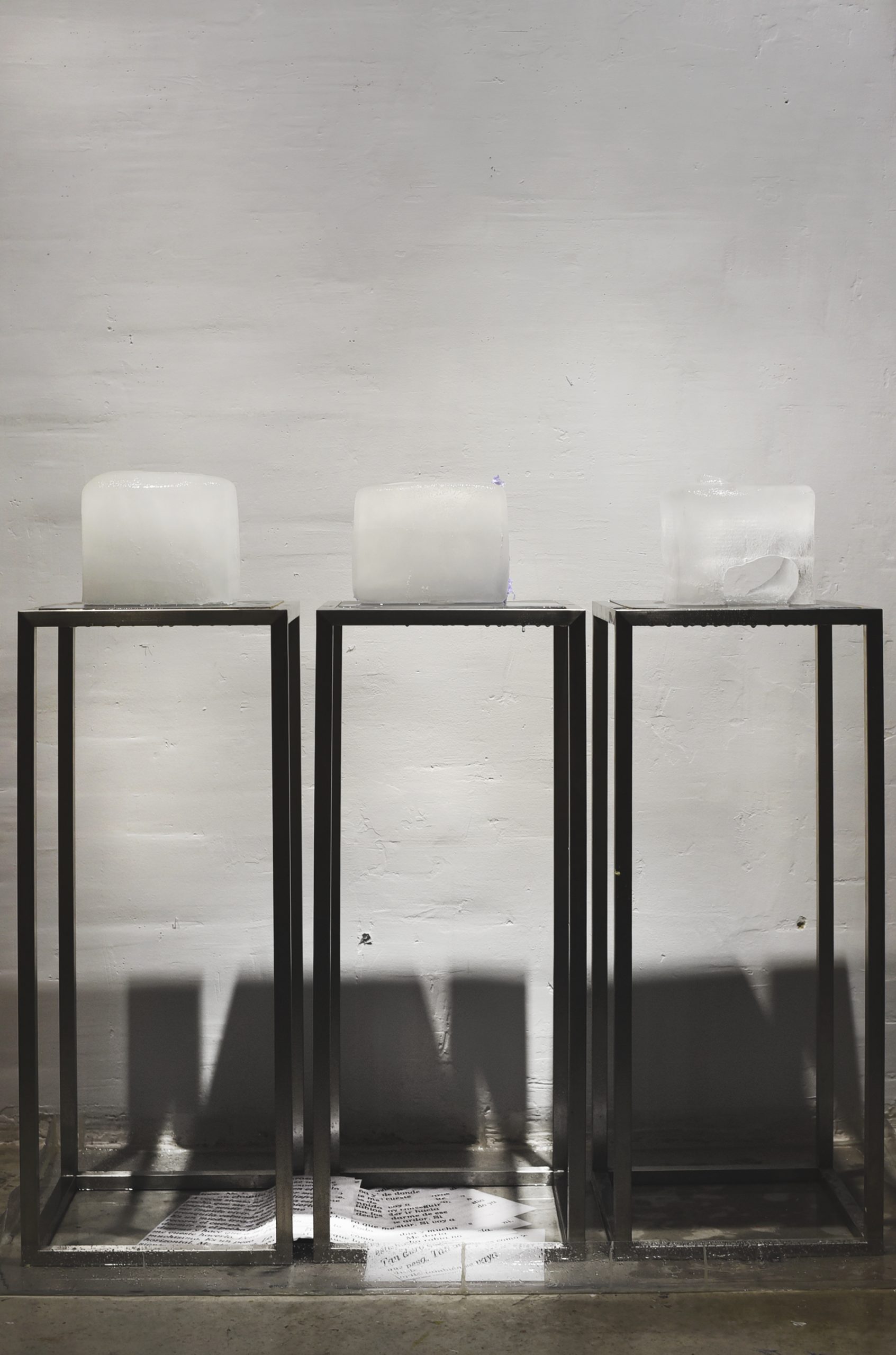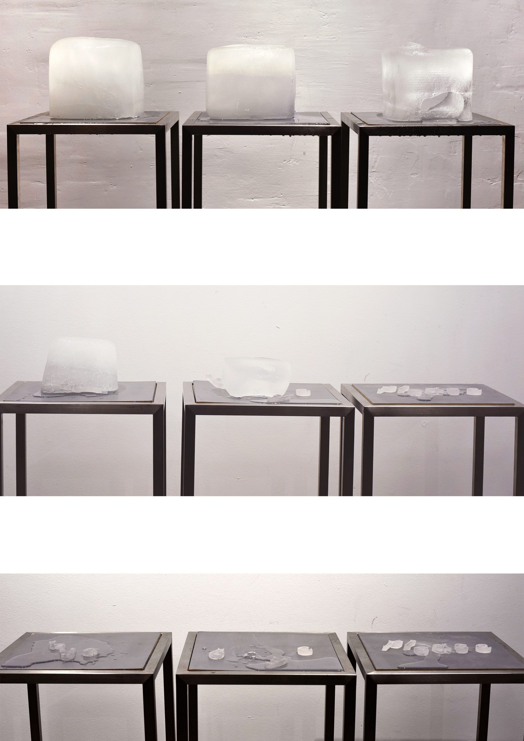 Tres bloques de hielo sobre tres peanas de metal.