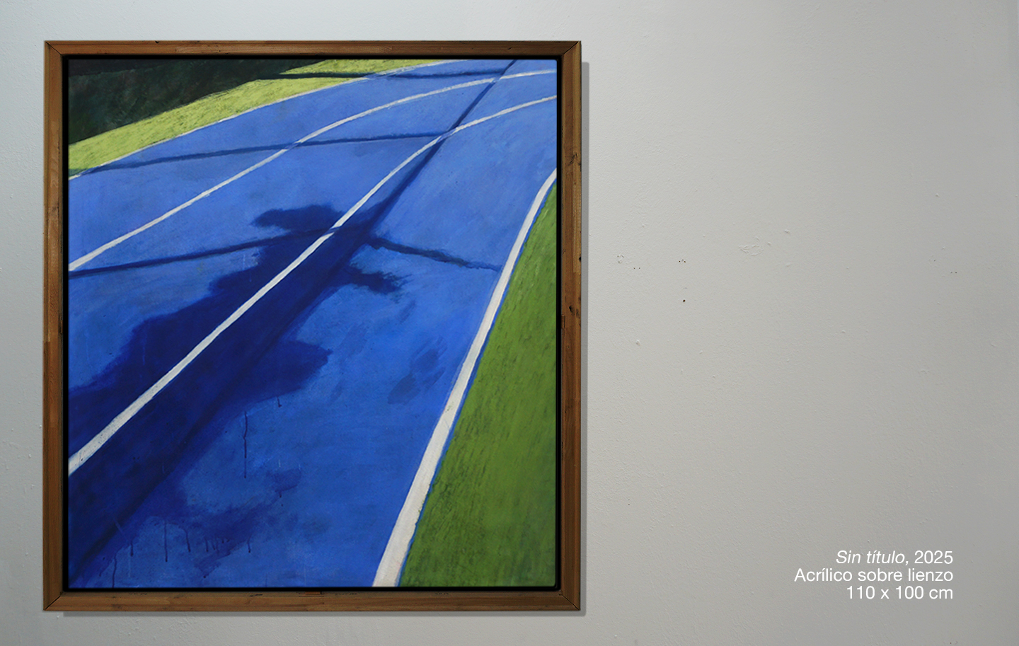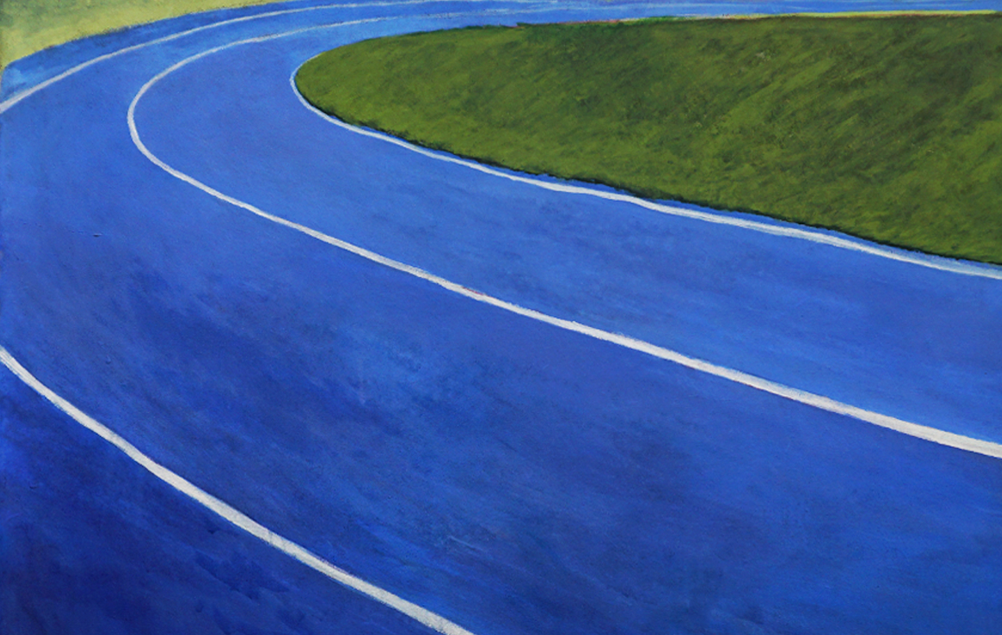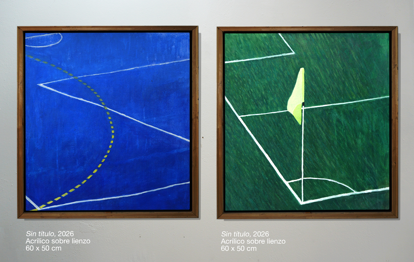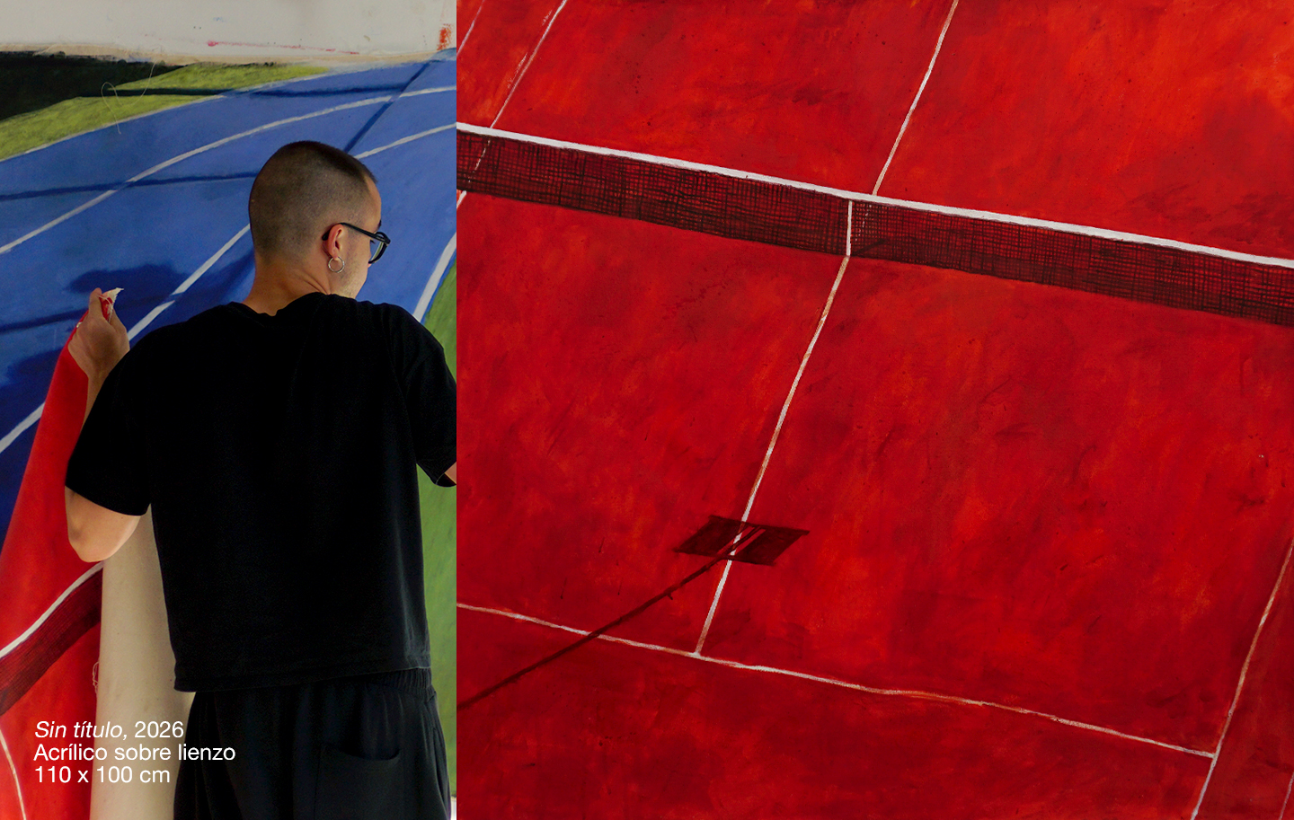 Mi pintura opera desde el icono, allí donde los símbolos están siempre presentes. Una serie de paisajes deportivos minimalistas en los que la geometría de canchas y pistas se transforma en planos de abstracción cromática. Me interesan las composiciones construidas a partir de grandes superficies de color, con una factura pictórica imperfecta: veladuras, manchas y pequeños desajustes que forman parte de la propia naturaleza de la pintura plástica.