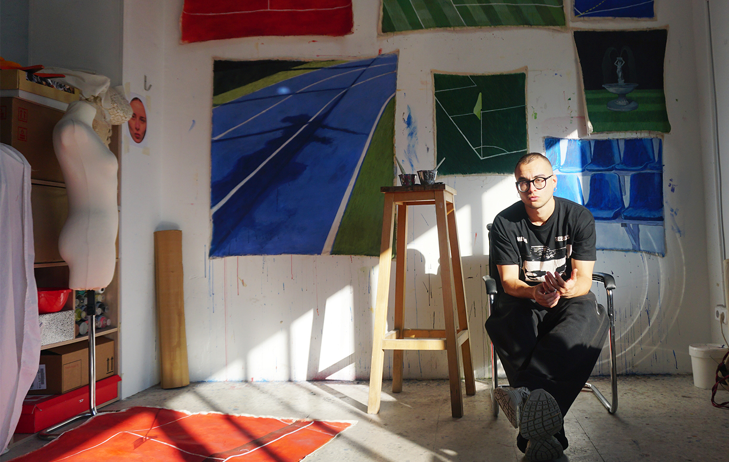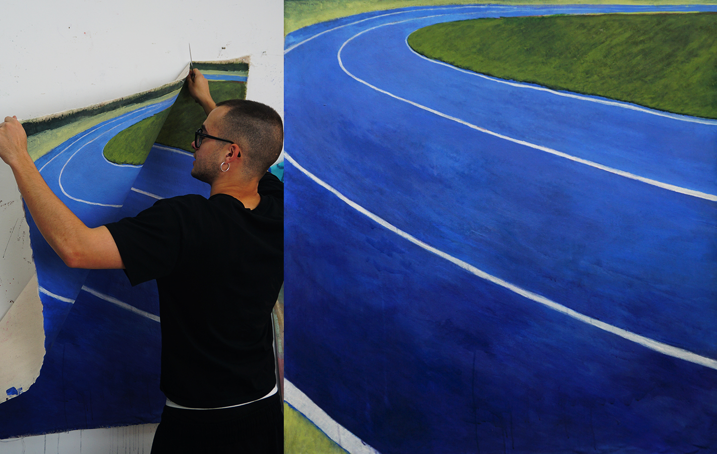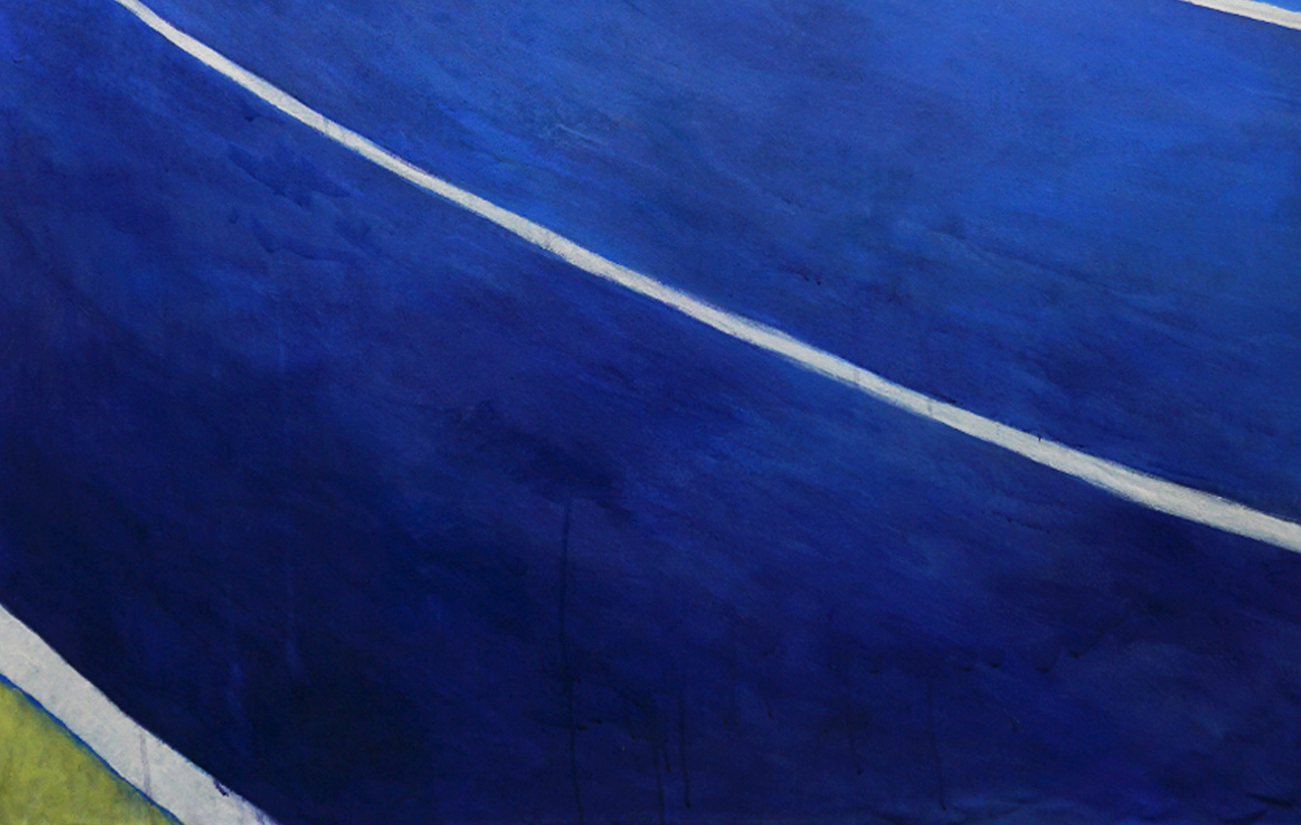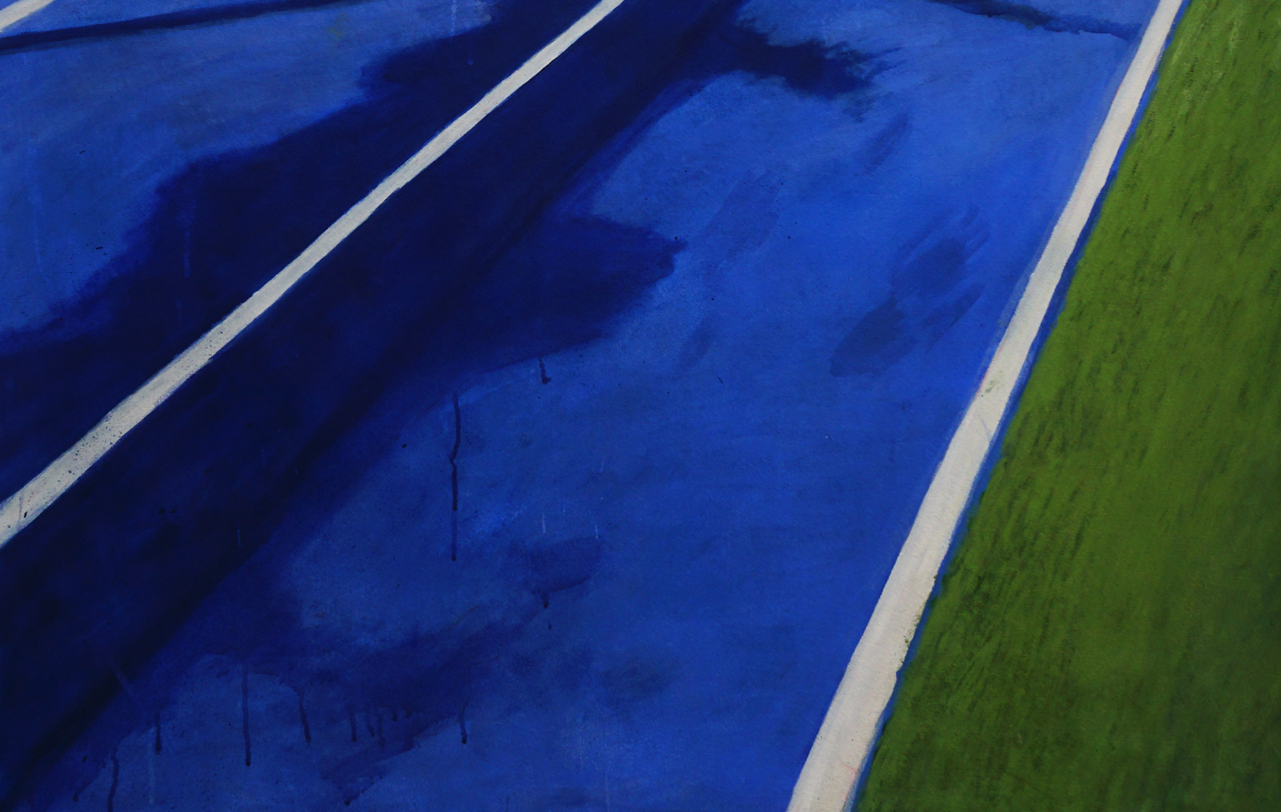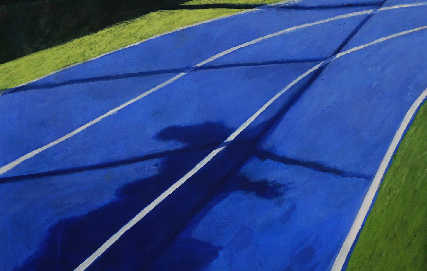 Mi pintura opera desde el icono, allí donde los símbolos están siempre presentes. Una serie de paisajes deportivos minimalistas en los que la geometría de canchas y pistas se transforma en planos de abstracción cromática. Me interesan las composiciones construidas a partir de grandes superficies de color, con una factura pictórica imperfecta: veladuras, manchas y pequeños desajustes que forman parte de la propia naturaleza de la pintura plástica.