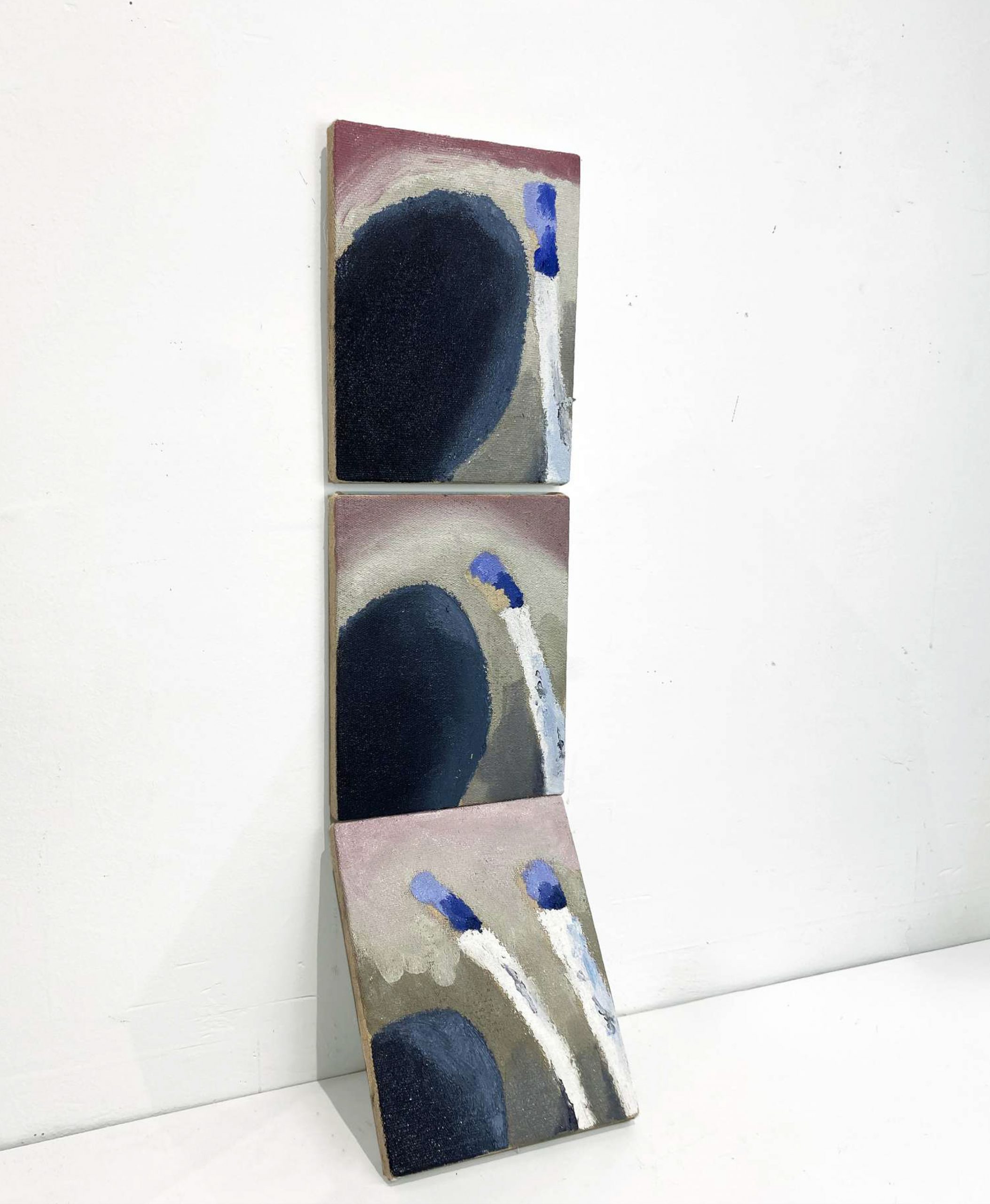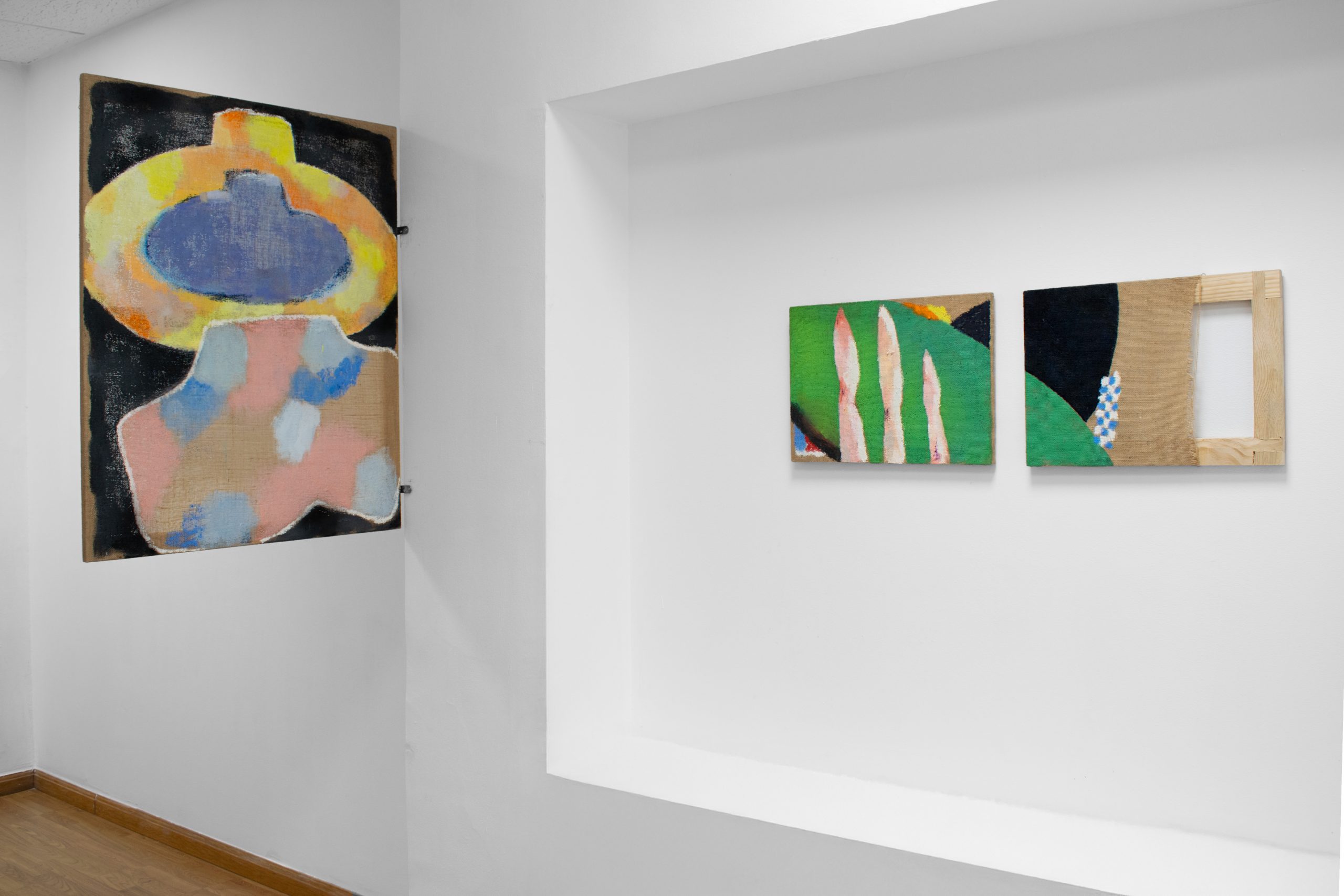 Espacios libre de pugmento revelan el vínculo entre el soporte y la pintura. Cómo se comporta un materia con un soporte que no puede absorberlo. La madera y el yute aparecen entre colores brillantes. El óleo se expande en manchas, se difumina. Interactúa con borrones y power-lines en un diálogo compositivo. Se pone a prueba el comportamiento de la misma figura en situaciones diversas. Con fondo. Sin nada más. A gran escala. A solas.