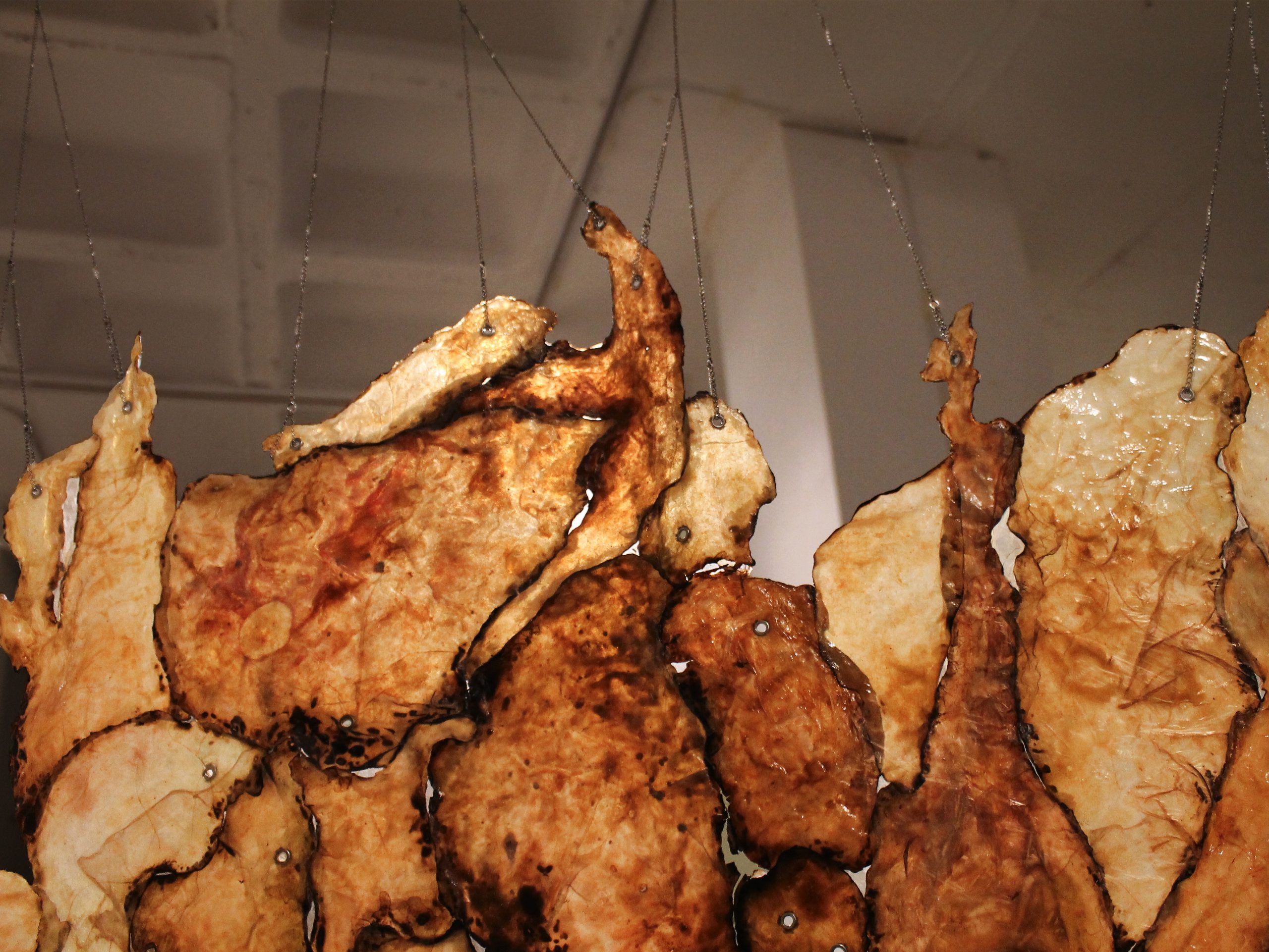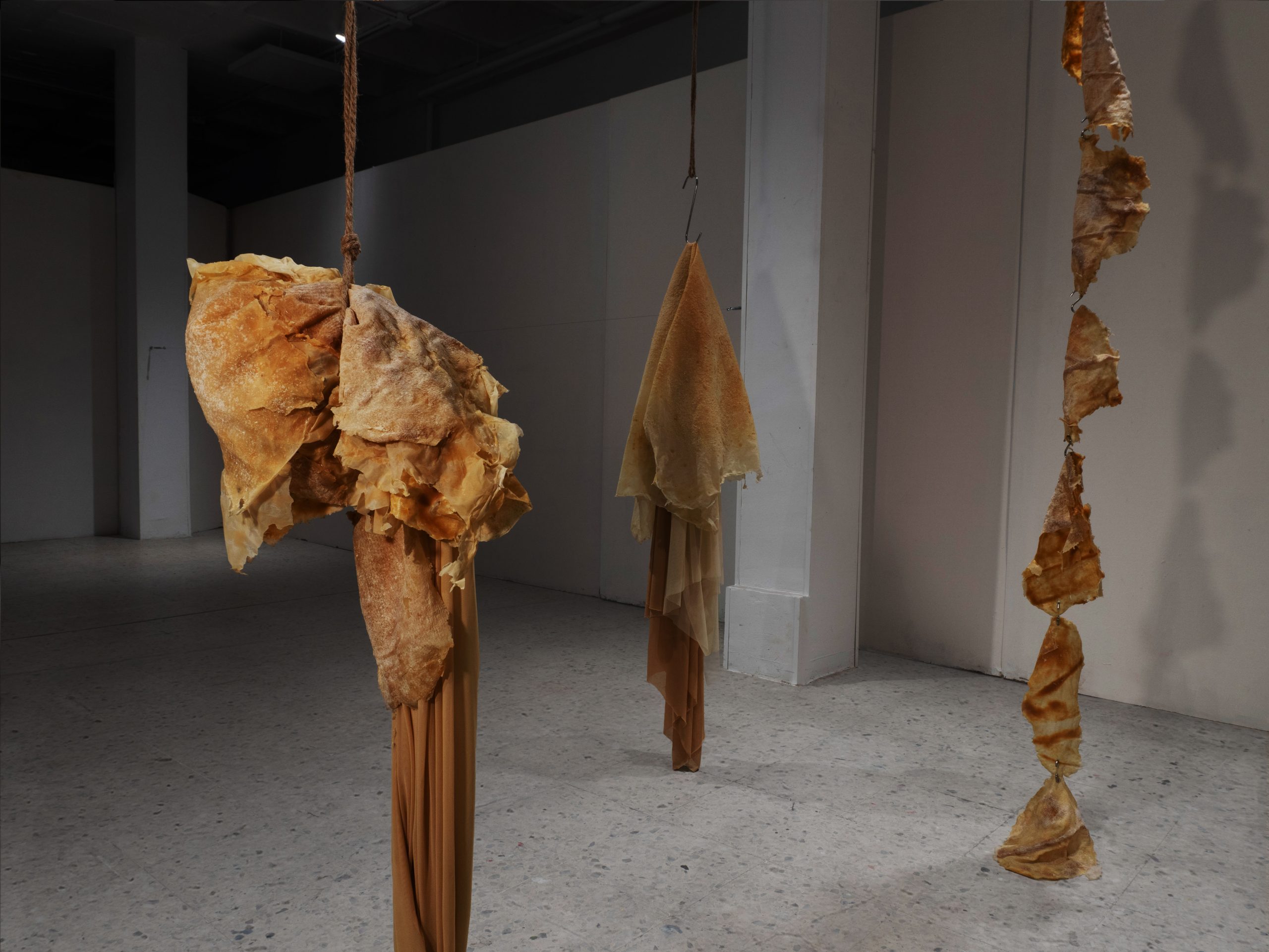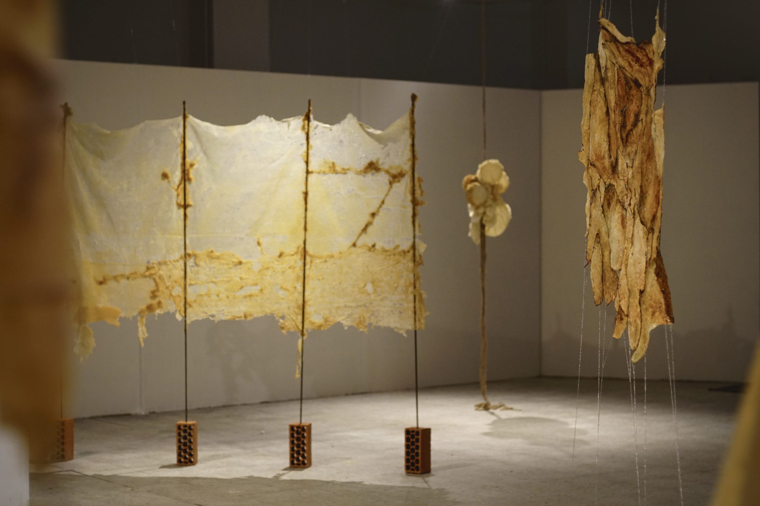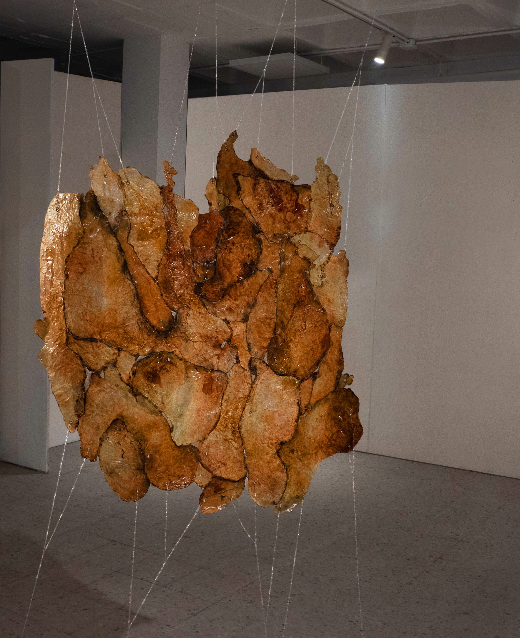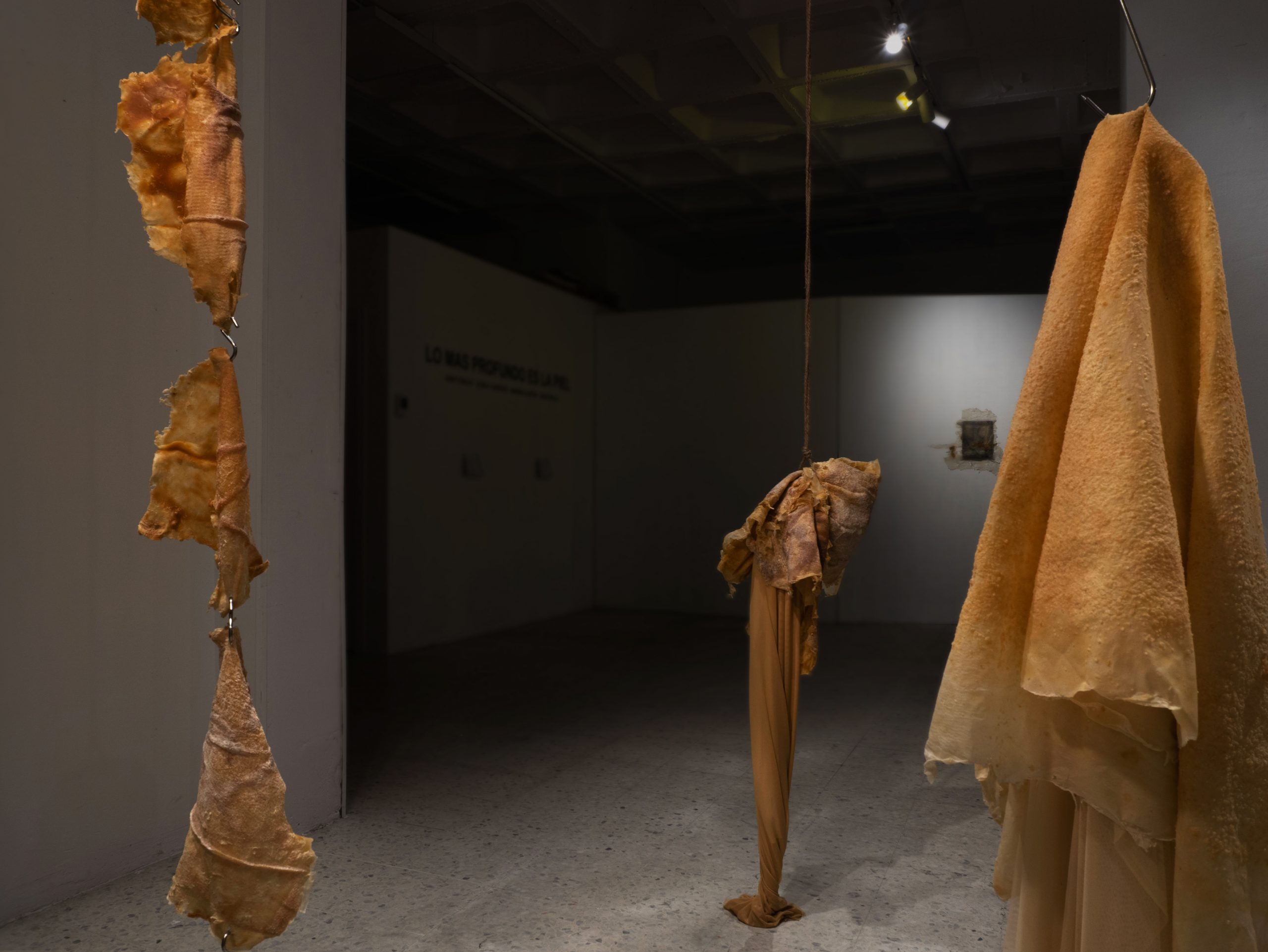 Gelatinas de colágeno animal, látex, celulosa bacteriana, pieles SCOBY, pegamentos sintéticos, combinados con sangre, tintes, y tierras se unen para el desdibujar los limites entre lo orgánico y lo sintético.