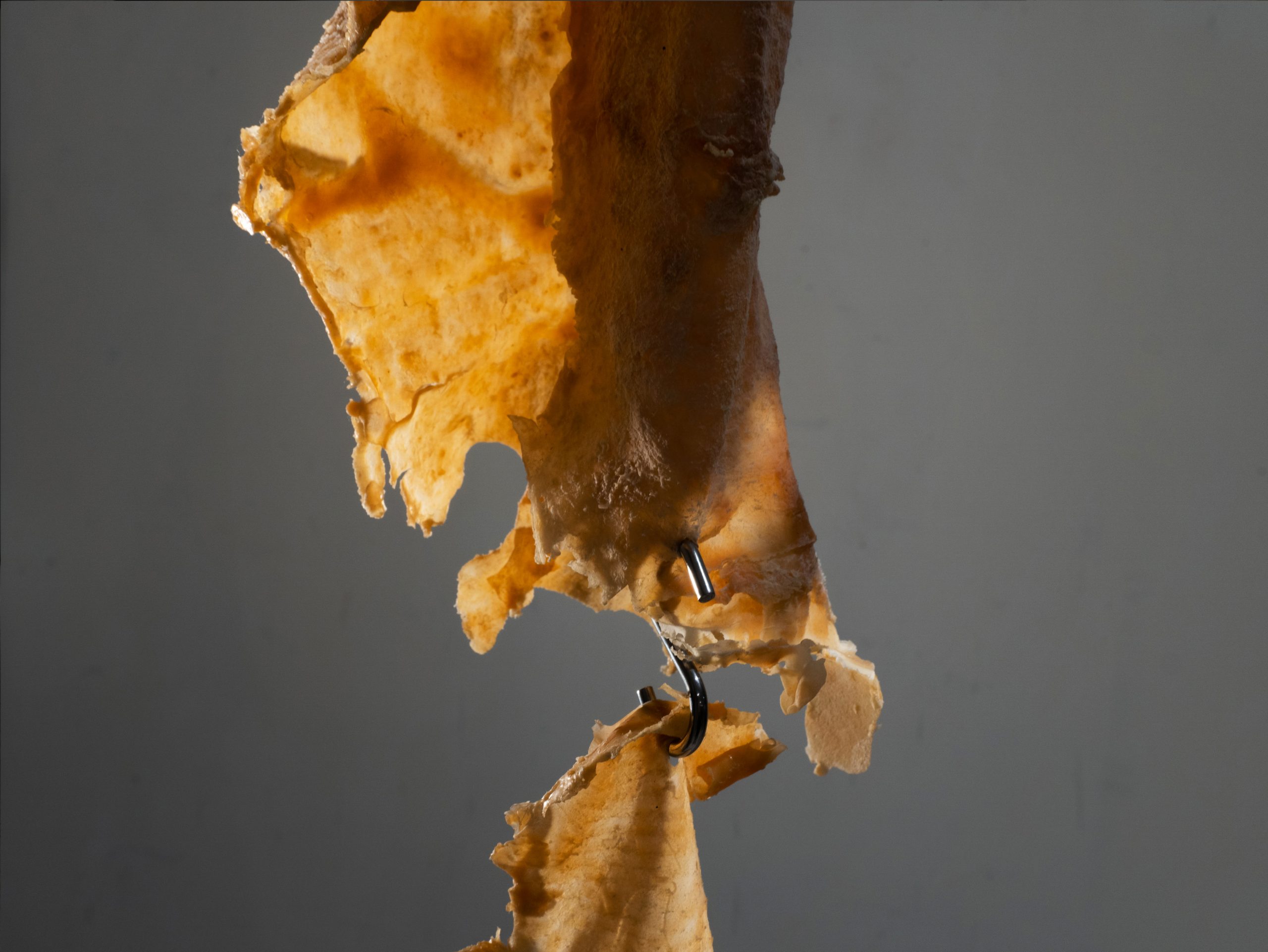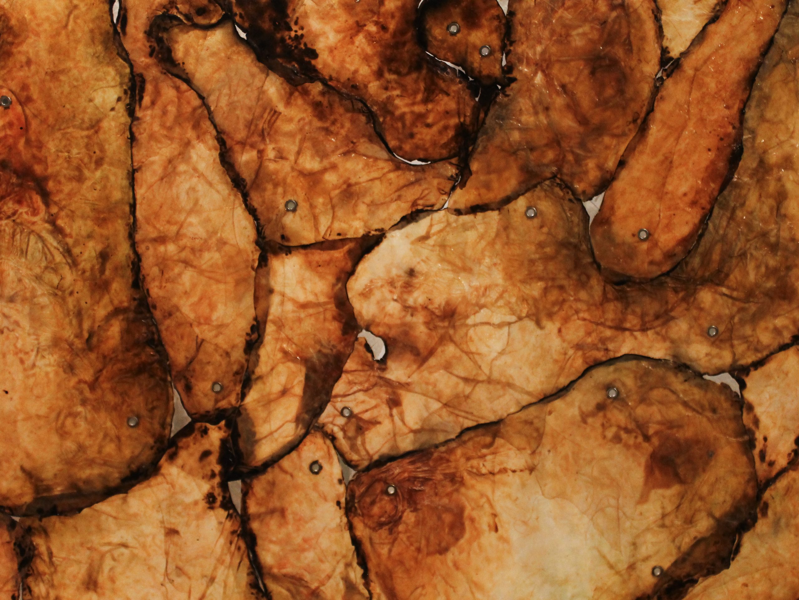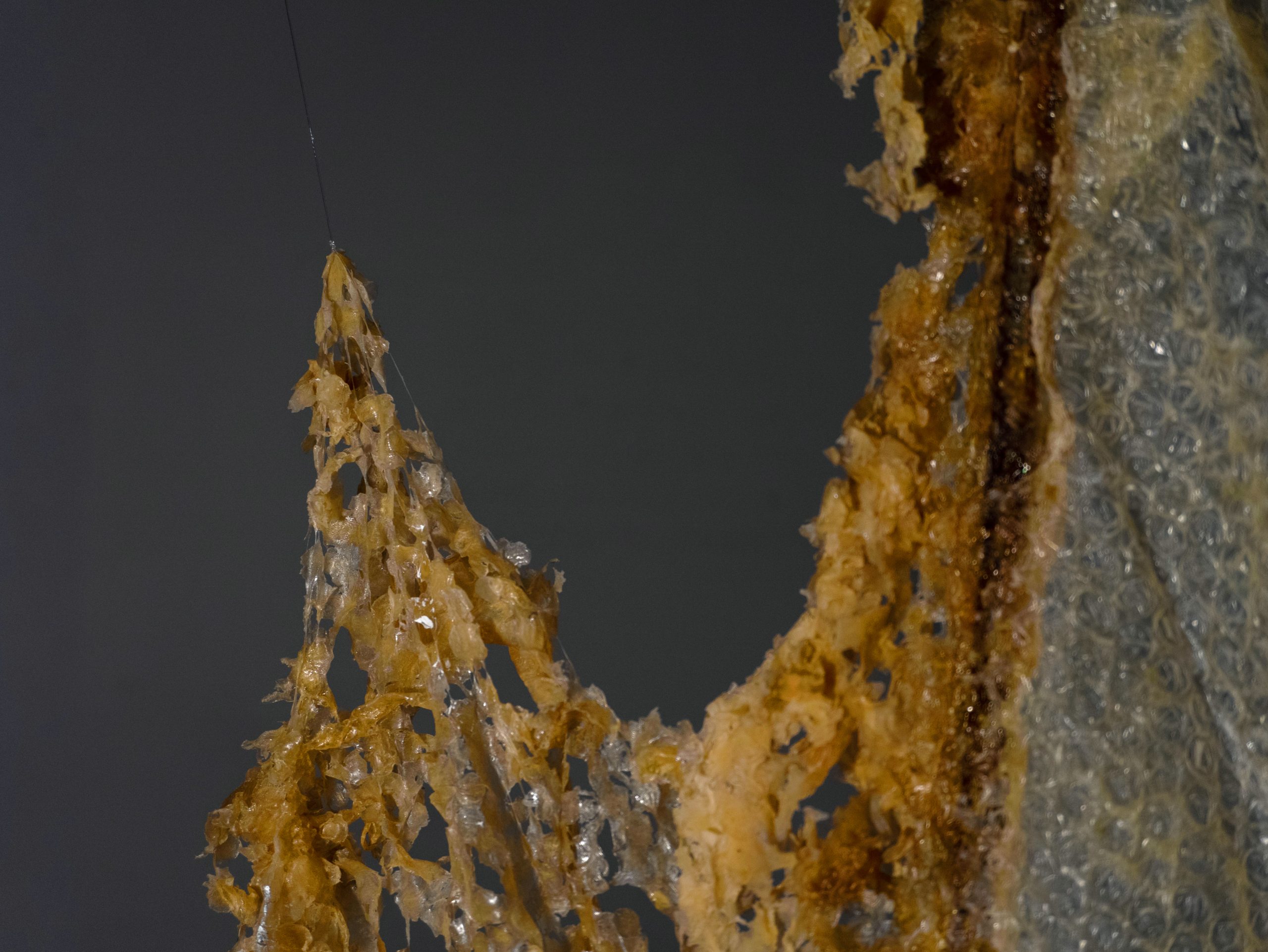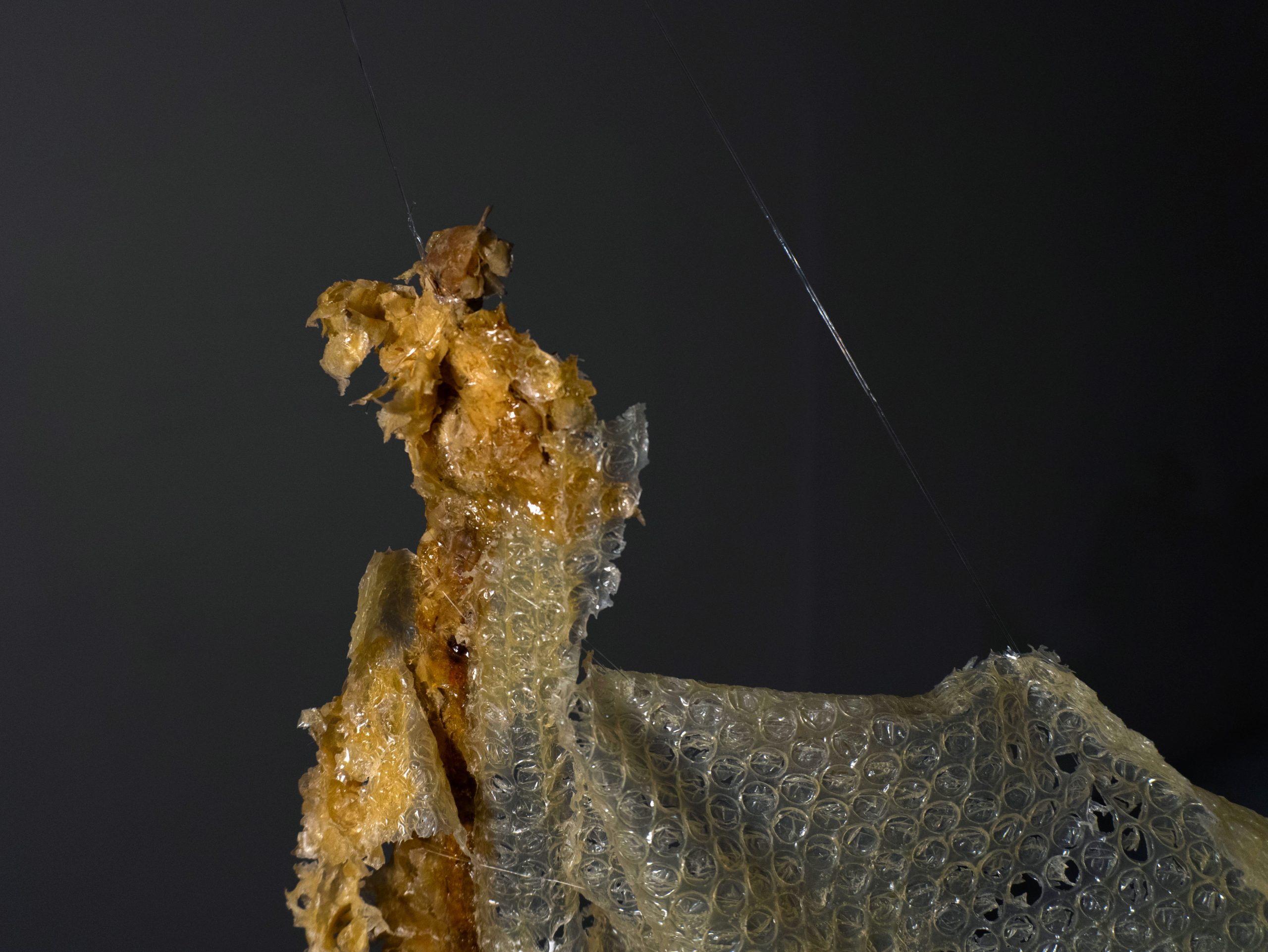 Gelatinas de colágeno animal, látex, celulosa bacteriana, pieles SCOBY, pegamentos sintéticos, combinados con sangre, tintes, y tierras se unen para el desdibujar los limites entre lo orgánico y lo sintético.