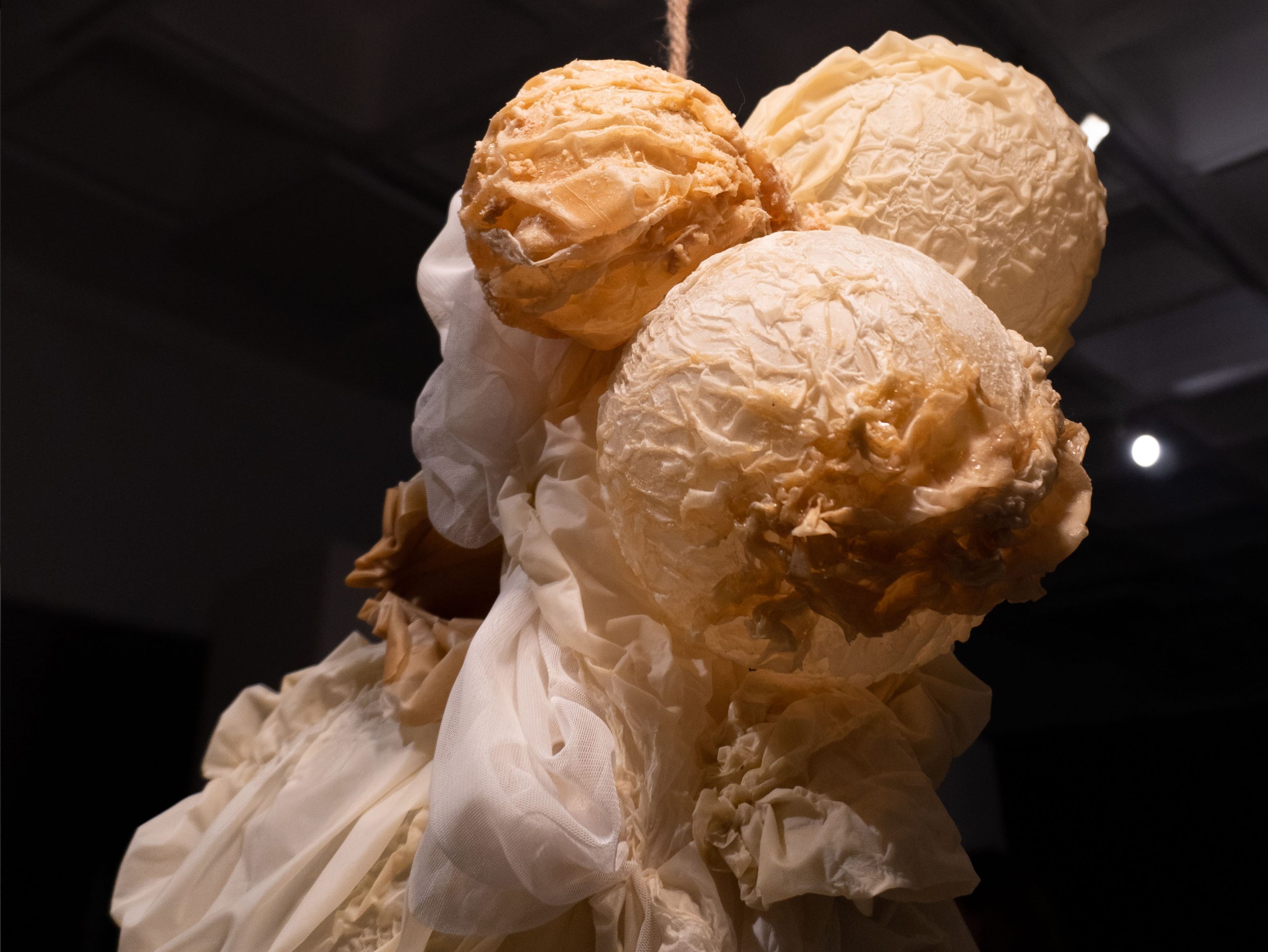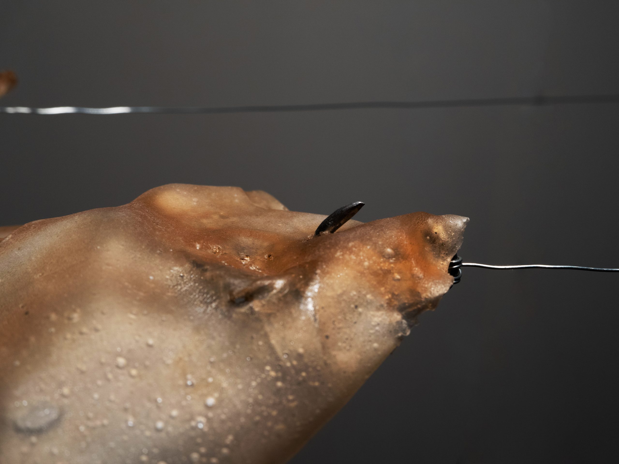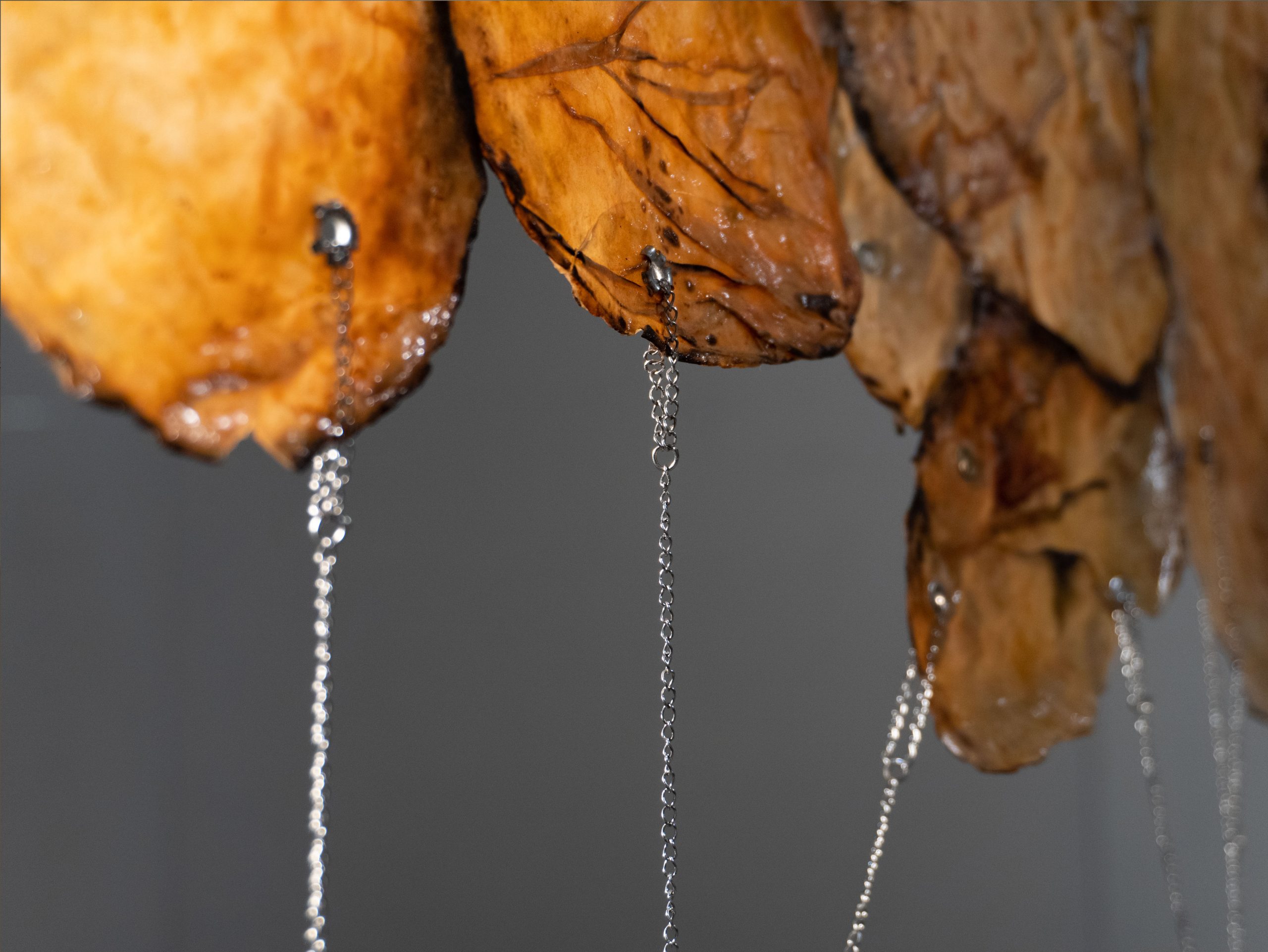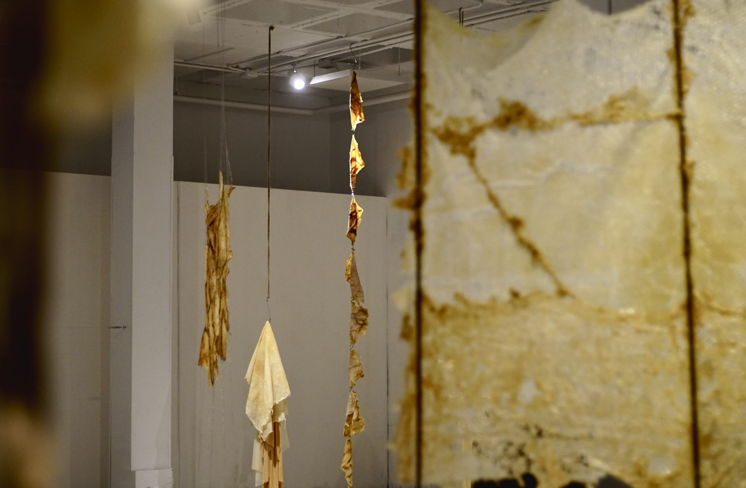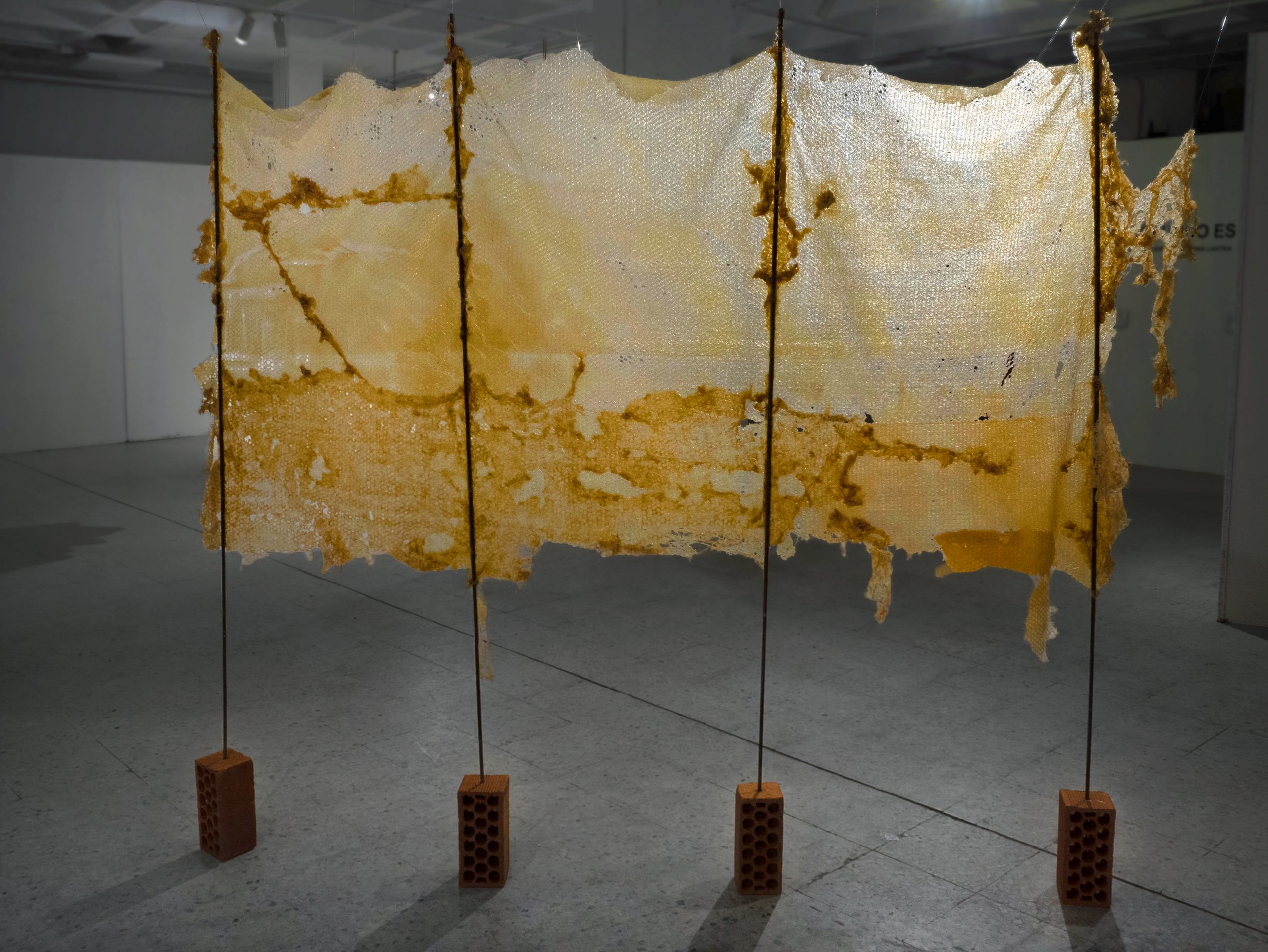 Gelatinas de colágeno animal, látex, celulosa bacteriana, pieles SCOBY, pegamentos sintéticos, combinados con sangre, tintes, y tierras se unen para el desdibujar los limites entre lo orgánico y lo sintético.