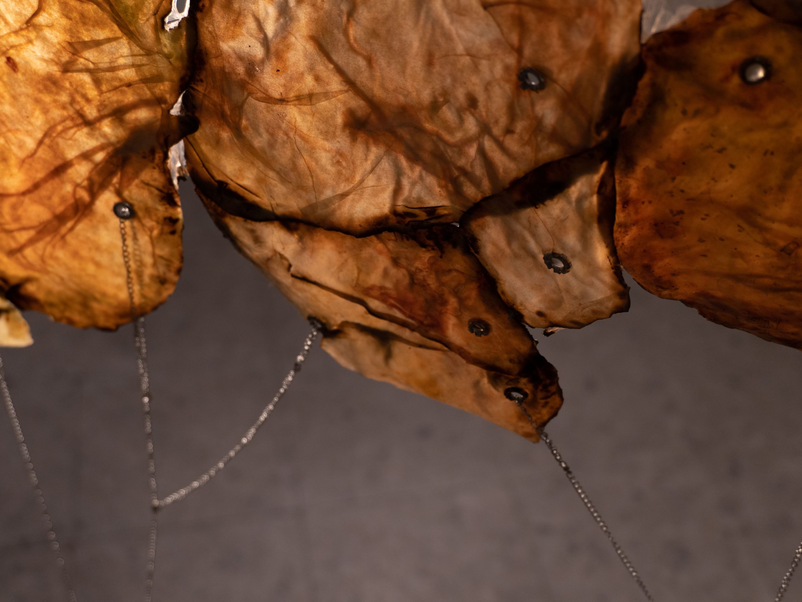 Una selección de piezas que continúan su investigación sobre la piel y las tensiones entre la violencia y la reparación: gestos de quemar para fusionar, perforar para estirar y coser para reparar.